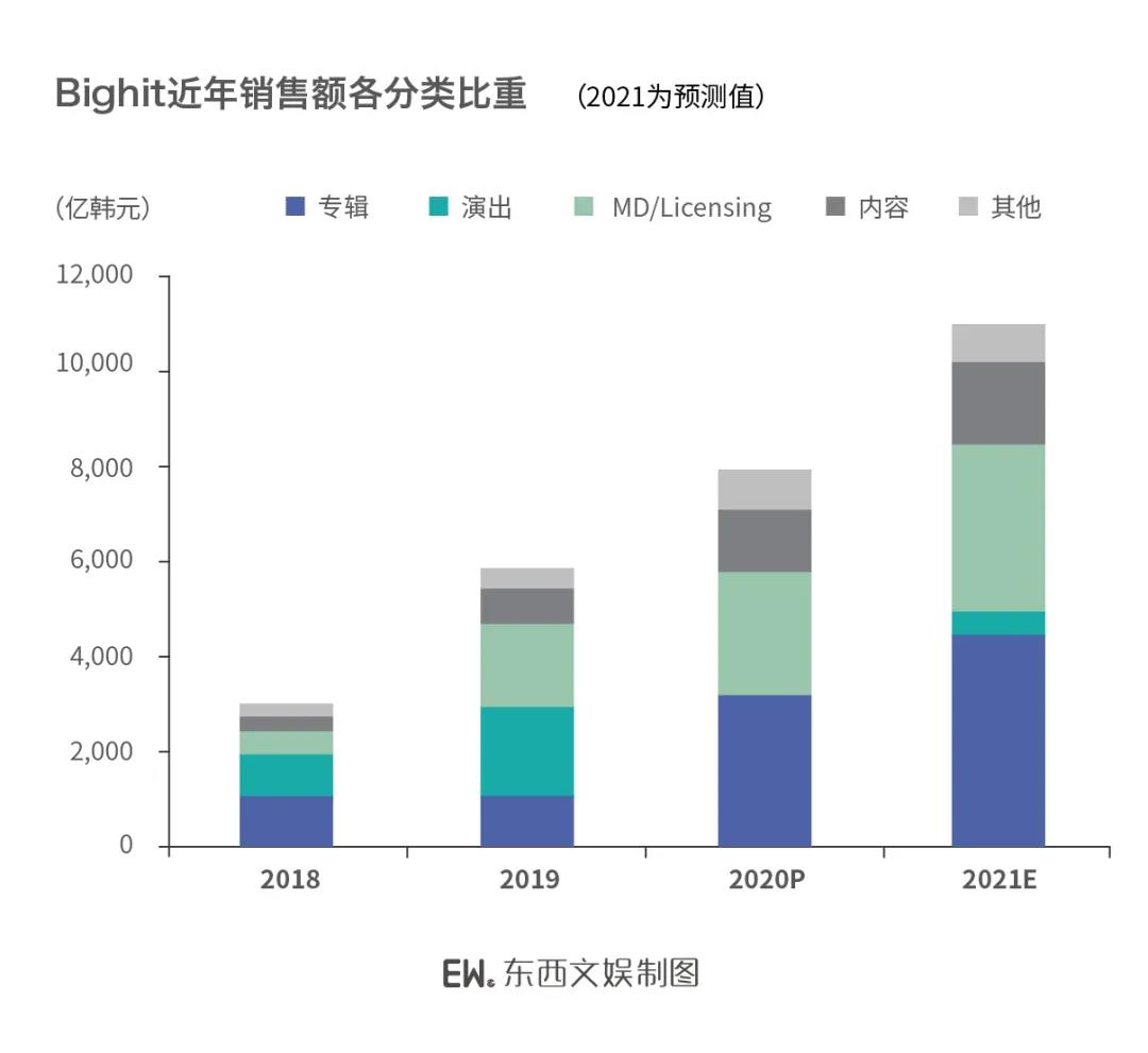 根据2021年Bighit商业战略,Bighit将通过三大业务的成长和相互协同达成业务扩张:三大业务指的是:Label(Artist打造 音乐内容制作),Solution (公演、视频、licensing、游戏、教育等多样产品和服务提供 ),而 Platform 即指 Weverse尖端化和生态扩大。