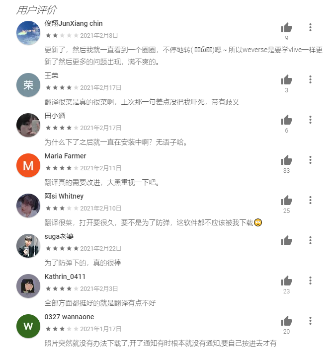 评论中提及最多的是Weverse的自动翻译太差、使用过程太卡两大问题。