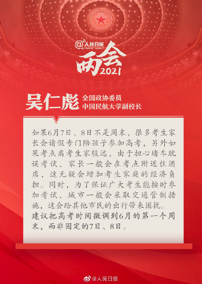 据人民日报,全国政协委员、中国民航大学副校长吴仁彪建议,高考时间微调到6月的第一个周末,而非固定的7日、8日。如果6月7日、8日不是周末,很多考生家长会请假专门陪孩子参加高考,交通管制也会影响市民出行。