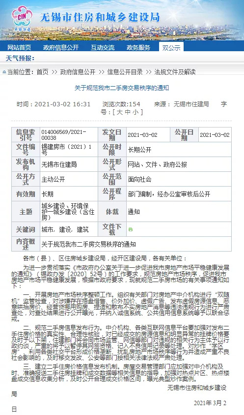 3月2日,据无锡市住房和城乡建设局网站显示,无锡市住建局发布规范二手房交易秩序的通知:建立二手住房价格信息发布机制。