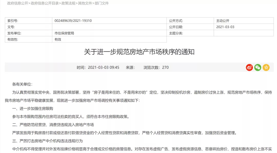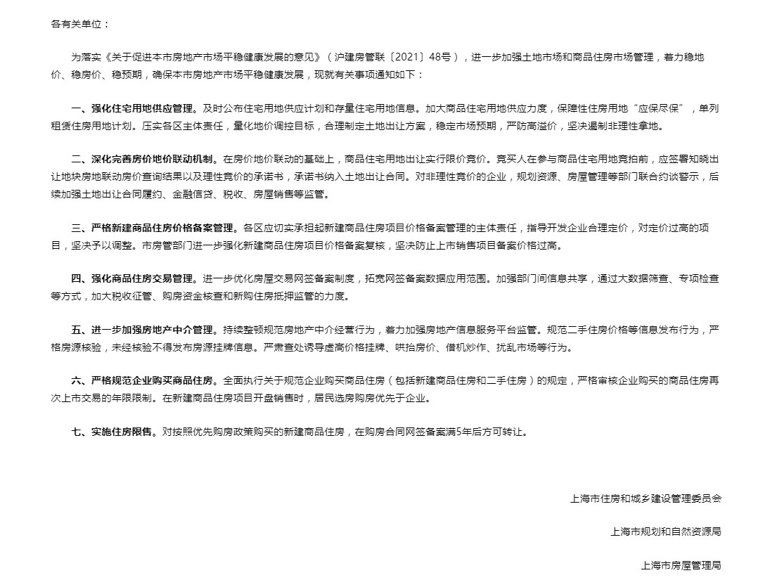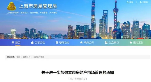3月3日,上海发布进一步加强本市房地产市场管理的通知。