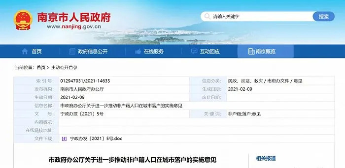 在落户政策上,2月18日,南京市人民政府官方网站发布了《关于进一步推动非户籍人口在城市落户的实施意见》,将进一步放宽落户政策。