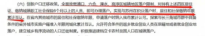 1、全面放宽浦口、六合、溧水、高淳区城镇地区落户限制,对持有上述四区居住证、缴纳城镇职工社会保险6个月以上的人员,即可办理落户;实现与苏州在积分落户时,居住和社保缴纳年限累计互认。在省内其他城市的居住和社保缴纳年限,申请落户时纳入我市累计认可;