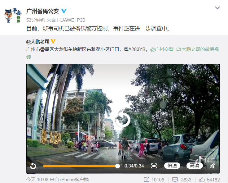 3月4日,有网传视频显示,广州番禺区一群小学生排队过斑马线时,学生队伍被一辆黑色轿车强行冲断,险些撞上学生。@广州番禺公安 4日晚间表示,目前,涉事司机已被番禺警方控制,事件正在进一步调查中。
