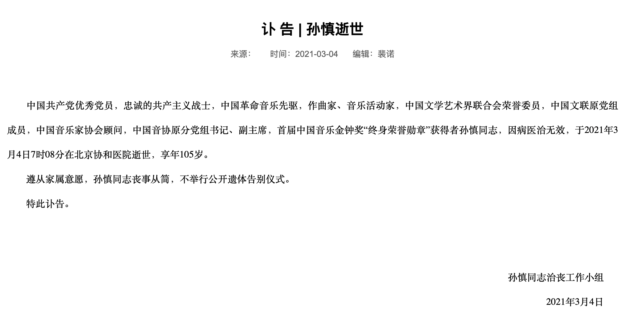 3月5日消息,中国音乐家协会昨晚在其官网发布讣告:中国革命音乐先驱,作曲家、音乐活动家,首届中国音乐金钟奖“终身荣誉勋章”获得者孙慎同志,因病医治无效,于2021年3月4日7时08分在北京协和医院逝世,享年105岁。
