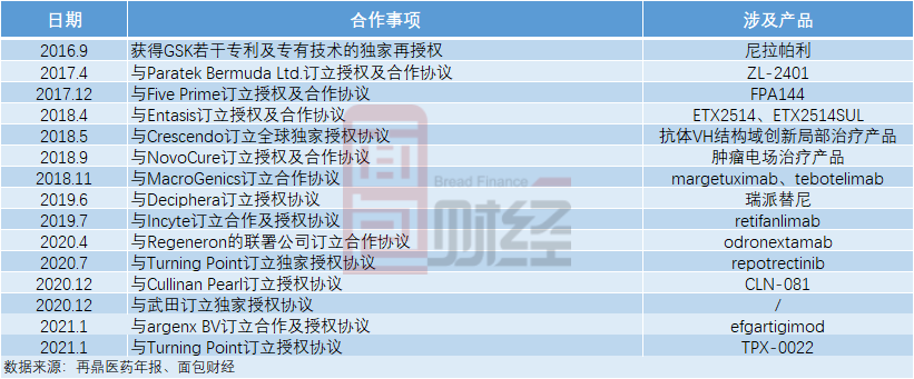 进入2021年以来,再鼎医药再次完成多项合作。2021年1月,再鼎医药公告与argenx BV订立合作及授权协议,公司获得有关argenx若干专利和专有技术的独家授权,以于大中华区开发和商业化产品。根据协议,公司将负责于中国招募患者参加argenx就开发efgartigimod而展开的全球注册性试验。就在同一个月,再鼎医药还与Turning Point订立授权协议。