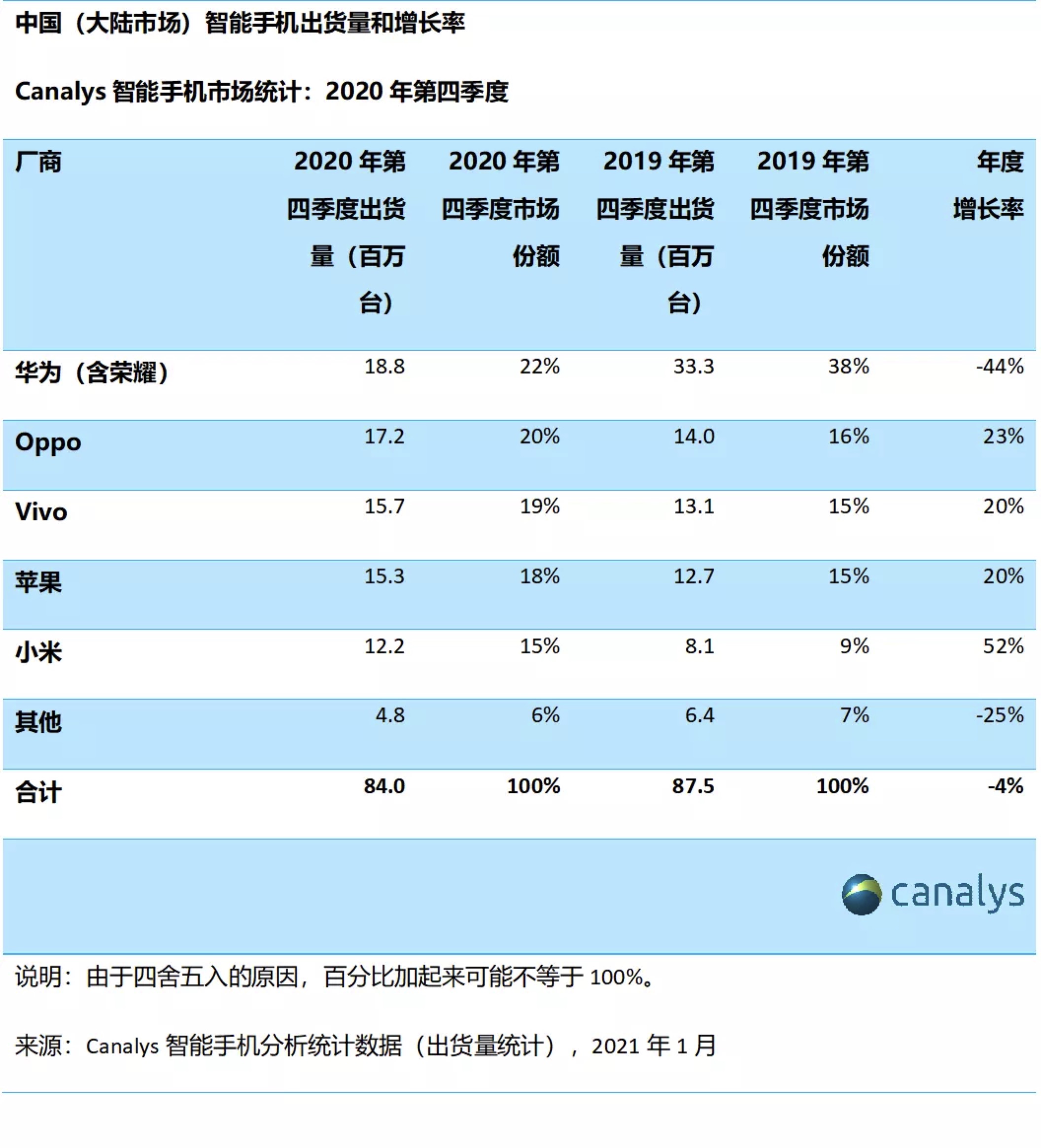 据“Canalys”微信公众号3月5日消息,市场调研机构Canalys发布的最新报告称,2020年第四季度,中国大陆智能手机出货量达到8400万部,同比下降4%。2020年第四季度,华为(包括荣耀)市场份额从2020年第三季度的41%下降至22%。2020年全年,华为(包括荣耀)继续保持领先地位,OPPO排名第二,Vivo位居第三。