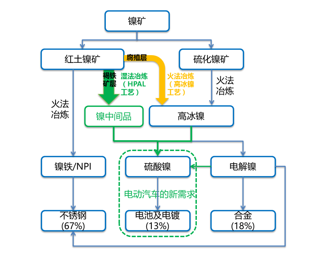 此前,这两条路线相对独立。如上图黄色标准路线所示,如今红土镍矿也能直接量产高冰镍,对硫酸镍来说,新增了原料来源,能一定程度上缓解此前镍中间品供应紧张的局面。