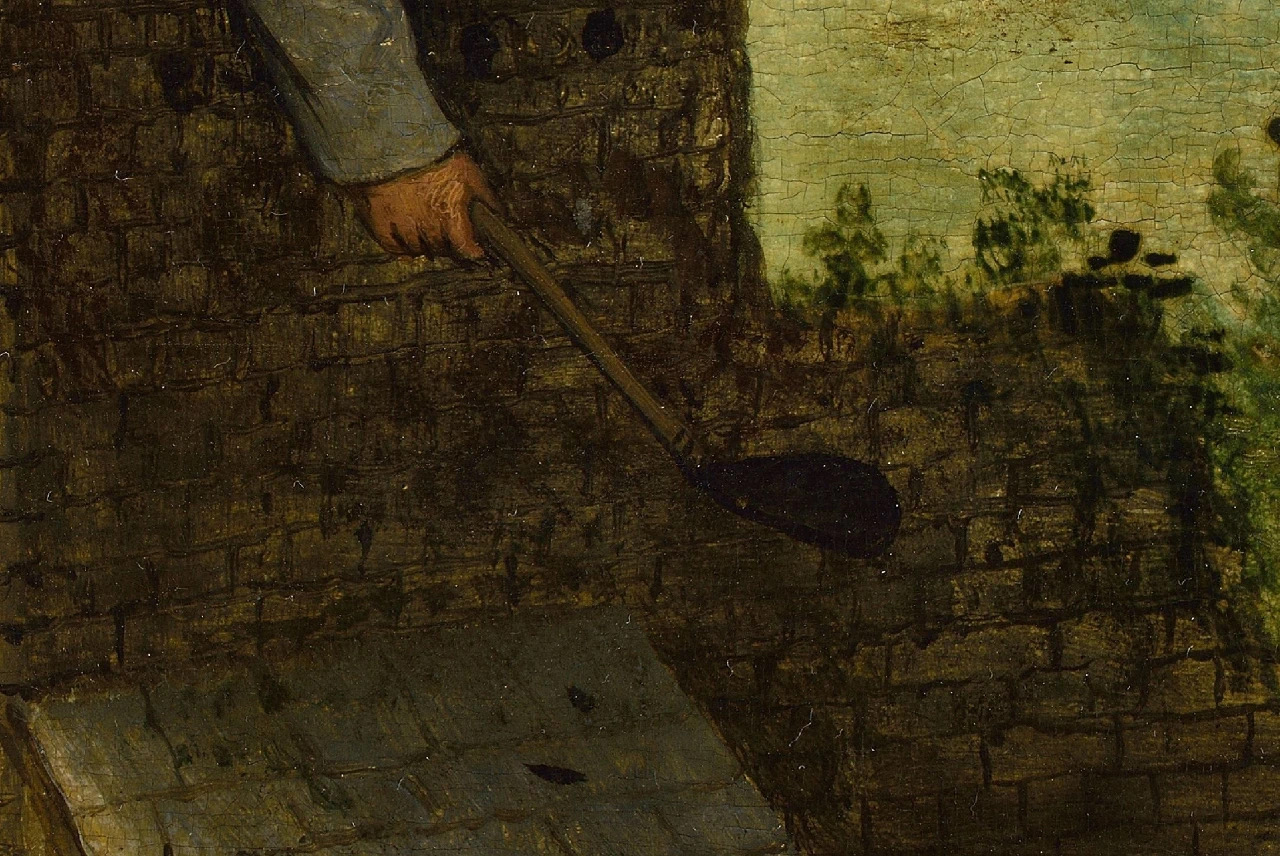 这类故事的真实性到底有多高并不要紧,关键在于画出足以乱真的苍蝇,确实不失为画家的一种真本事。当然,画苍蝇也不全是为了炫技。当画家们考虑它是否可纳入宗教题材的绘画时,就有了不一样的态度。拉斐尔的父亲乔万尼·桑蒂是乌尔比诺公爵的宫廷画家,画出逼真的苍蝇应该不是什么问题,可是,据说,他并不想为了调侃或逗乐以及展示画技,而将苍蝇的细节加在神圣的图像里。如果要把苍蝇加在受难的基督身上,那么,其目的就应该是引起观者对基督的尘世肉身的关注。乔万尼·桑蒂到底画没画过苍蝇,现在已经无从确证了,倒是北方画家布勒格尔给了我们一个特别的例子。在大师笔下,苍蝇竟意想不到地成了讽刺人之愚蠢的一种绝妙道具。在他的名作《尼德兰的寓言》(一五五九年)一画中,有人从一座塔中探出头来,要用蝇拍打死下面茅舍斜屋顶上的苍蝇。重点是,此公一心要一拍下去,同时打死两只苍蝇!从来就难得有所谓的“一石二鸟”,不过是比方而已,可是,还真没有听说过“一拍二蝇”。可惜,摄影配图总是在再现那些微小细节时难以差强人意,唯有亲睹大师的原作,才会有看得真切时的无上惬意。