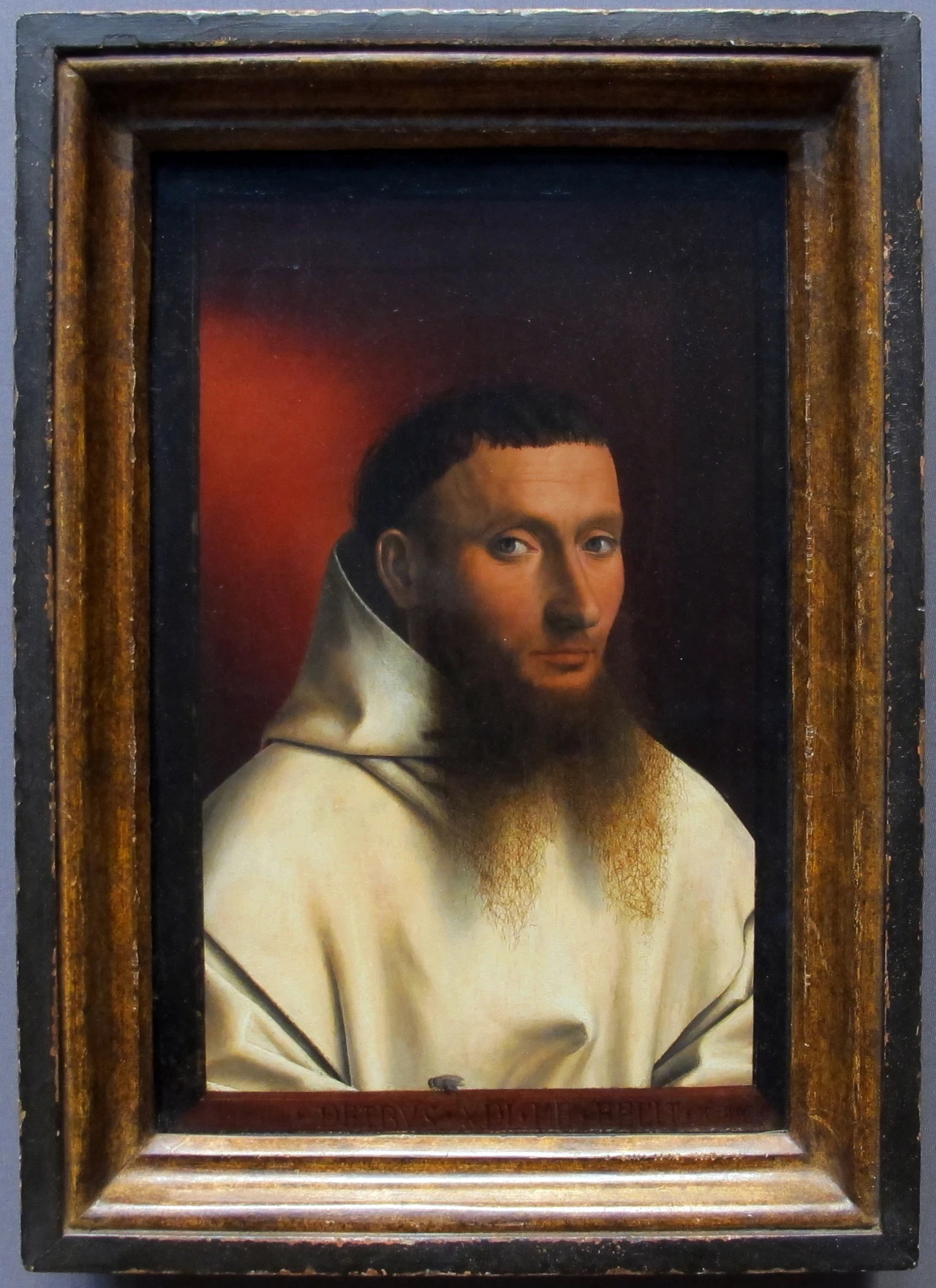 我们在人物肖像画中偶尔也能瞥见苍蝇的存在。十五世纪的尼德兰画家彼得鲁斯·克里斯图斯生平崇拜的是凡·埃克那样的大师,因而,无论是大画还是小画,他均对其中的细节苦心经营。譬如,藏于纽约大都会艺术博物馆的《加尔都西会教士肖像》(约一四四六年)无疑是其最精彩的作品之一。其中精心描绘的是在窗边的加尔都西会教士,而在貌似窗台底边的地方竟赫然有一爬行着的苍蝇!除了表明画技已非凡到足以愚弄人眼之外,这一细节也暗示着任何肉身都不免死亡和消失的结果。