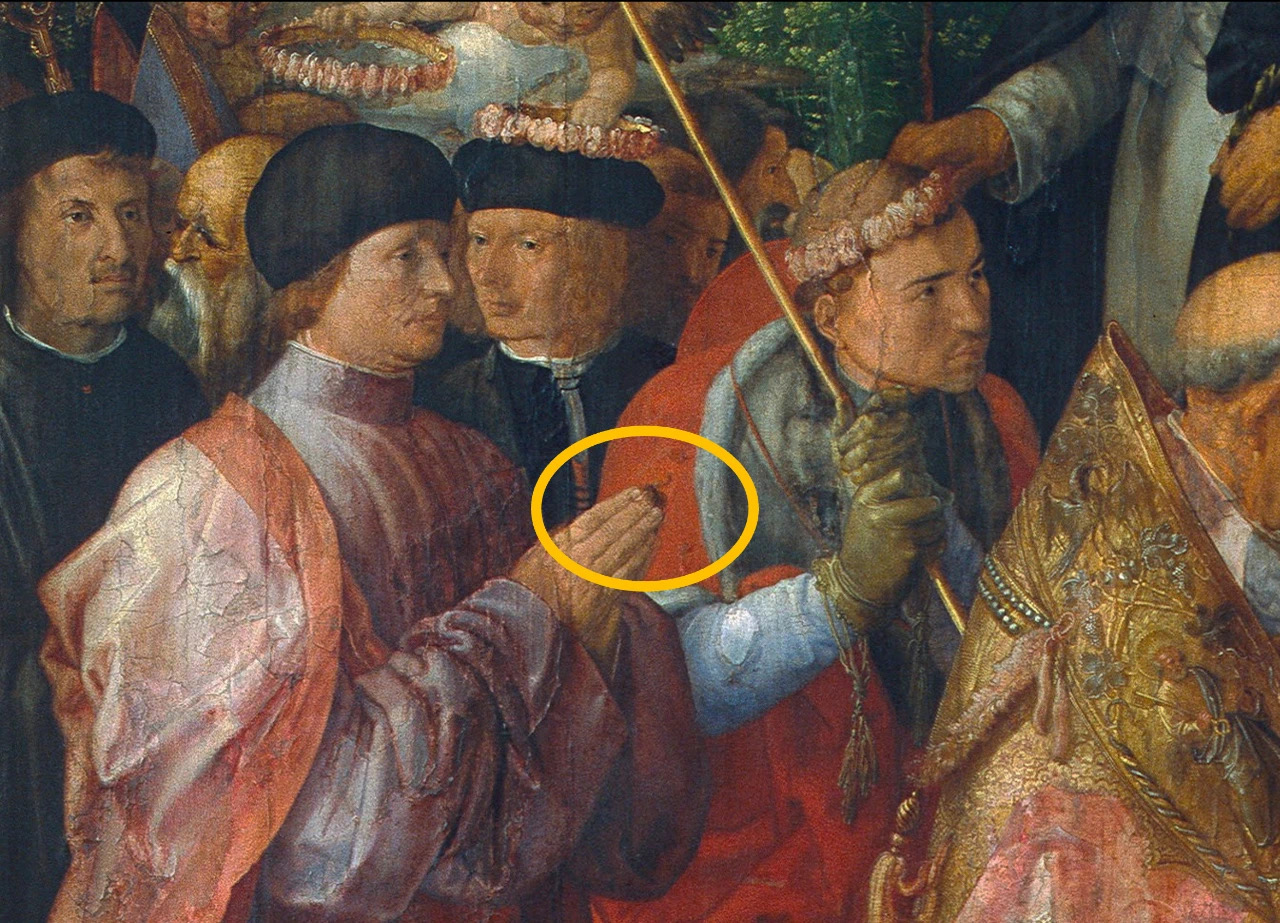 二〇一九年十二月我出差到捷克,其间有机会去布拉格国家美术馆观摩。我最想看的画作自然是北方文艺复兴大师丢勒的大幅作品《玫瑰花环节》(约一五〇六年),而且,我事先就听说过,这幅名画中不仅有画家的自画像(右上侧手持一小纸条的人,上面有他的签名和“花了五个月才画完”的字样),同时,画中还有一只小小的苍蝇是不能漏过的。同行的几位友人不明白我为什么对此画竟有这种特殊的兴趣,当看到一只苍蝇停在神职人员指尖上的细节,又不禁啧啧称奇。不过,这只苍蝇意味着什么,并没有明确而又统一的说法,有的学者只将其看作丢勒的视觉幽默。可见,判断画中的苍蝇意指何物,还赖于特定画面给予的具体上下文。