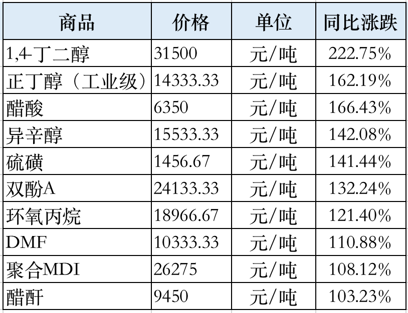生意社数据显示,目前BDO的最新报价为31500元/吨,同比增长222.75%,处于近12年的高位。工业级正丁醇报价为14333.33元/吨,同比增长162.19%;醋酸报价为6350元/吨,同比增长161.43%。