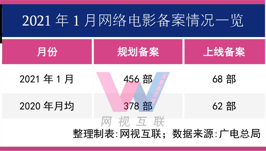 要知道,2020年全年通过规划备案的网络电影是4533部,平均每月才378部。1月份规划备案数量比2020年月均增长了21%。