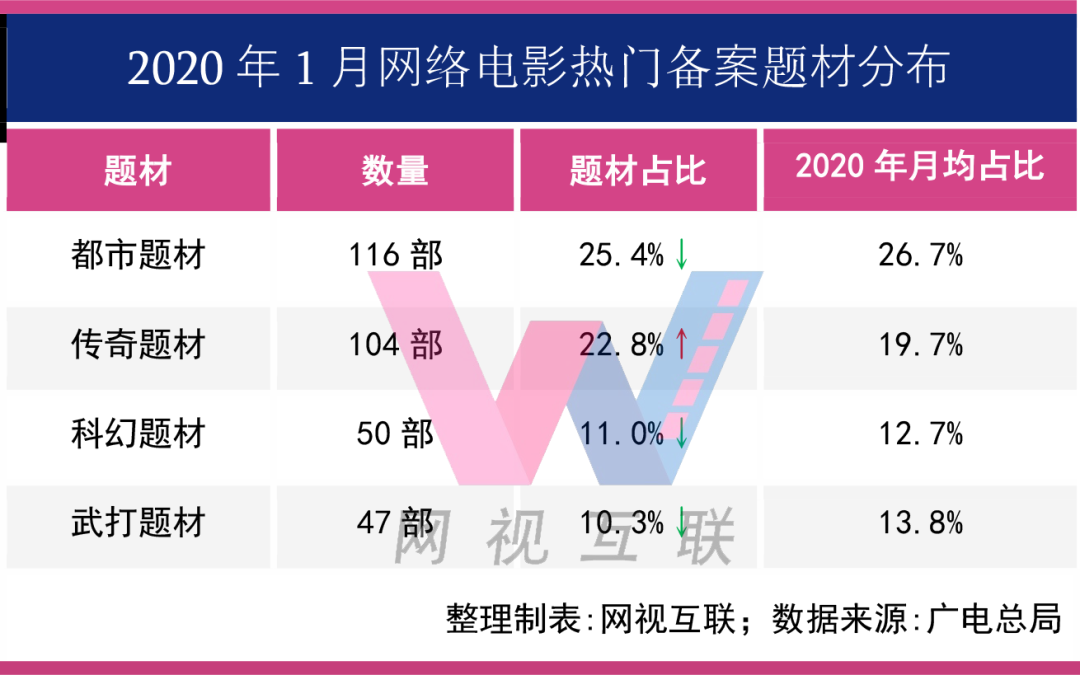 事实上,作为现实题材主力军的都市题材出现了下滑,以往都市题材的比例甚至能占到30%,而1月份仅116部,占比25.4%。