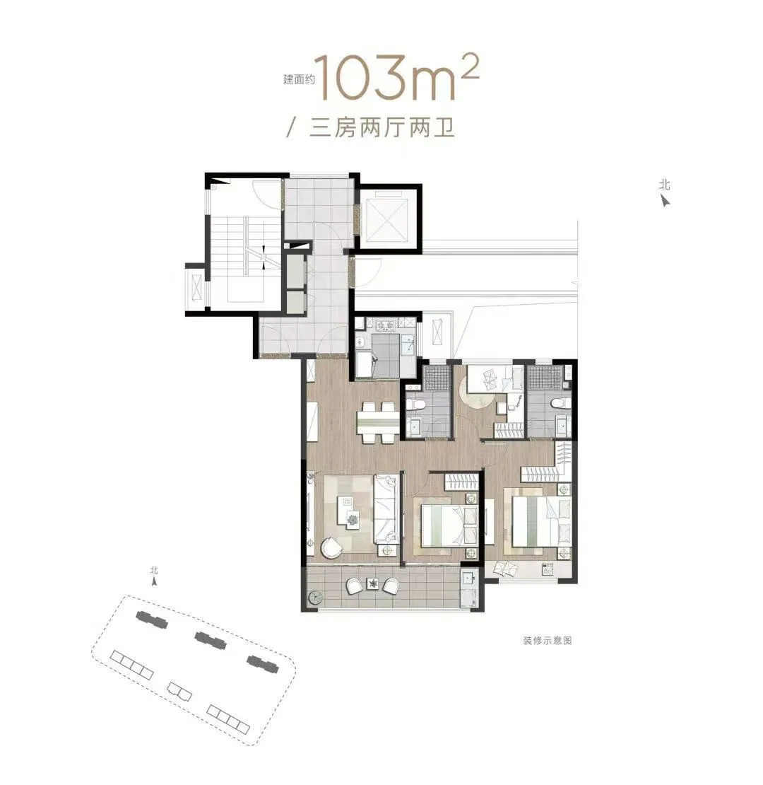 建筑面积约103㎡:三房两厅两卫