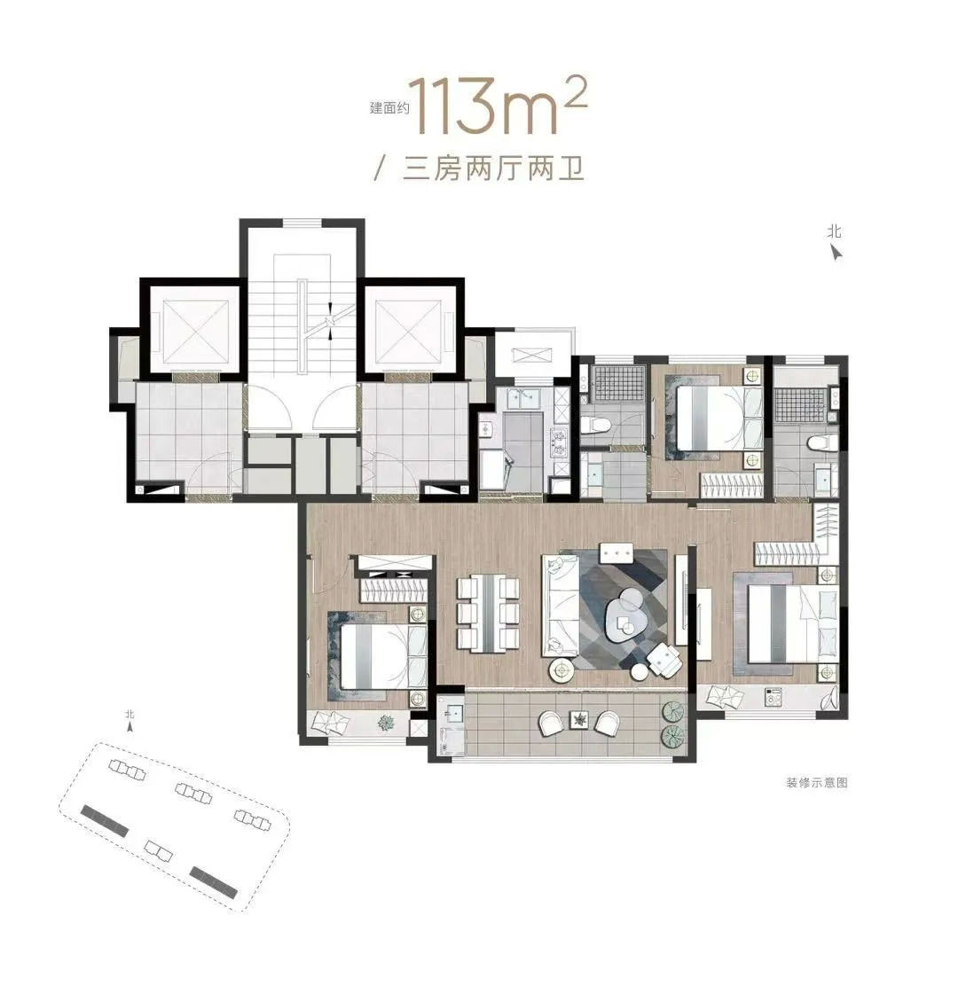 建筑面积约113㎡:三房两厅两卫