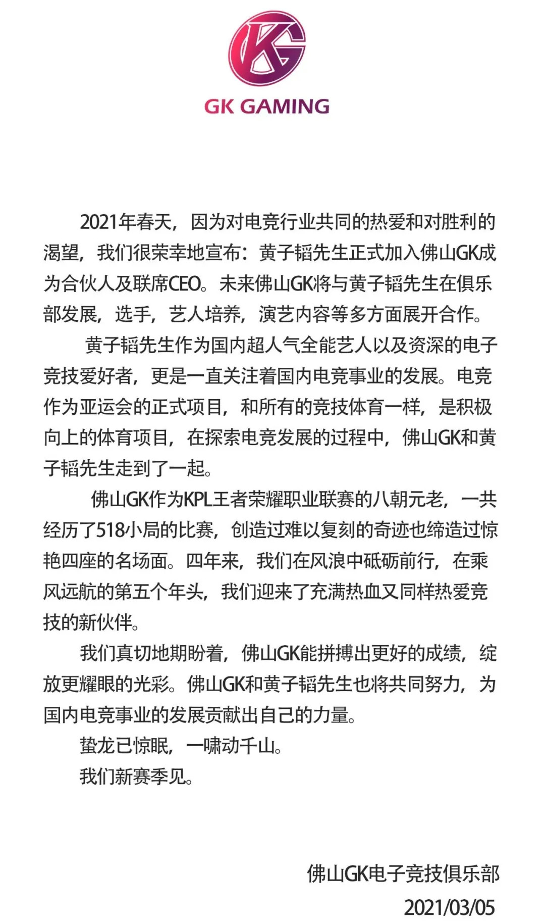 2021年3月5日,佛山GK电子竞技俱乐部发布公告,宣布黄子韬以合伙人和联席CEO的身份加入GK,未来将与俱乐部在选手及艺人培养等方面展开合作。