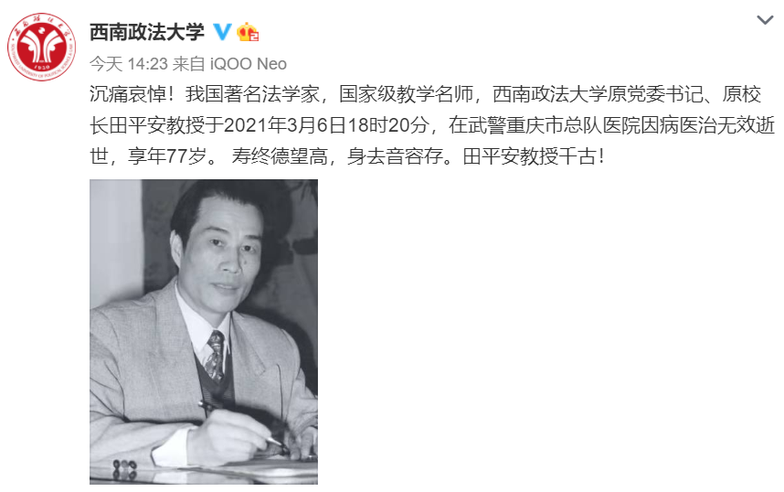 据@西南政法大学 微博3月7日消息,我国著名法学家,国家级教学名师,西南政法大学原党委书记、原校长田平安教授于2021年3月6日18时20分,在武警重庆市总队医院因病医治无效逝世,享年77岁。