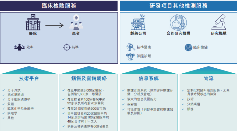 2003年该公司成立初始,康圣环球从事独立血液学临床特检。该公司称“已于中国独立血液学临床特检行业成功确立主导地位”。据弗若斯特沙利文,按收入计,2019年康圣环球占据最大(或42%)的市场份额。康圣环球称,在中国所有独立特检供货商中,其拥有最大的特检组合,在服务选单上提供逾3500种检验项目,其中血液学检验项目约2300种。