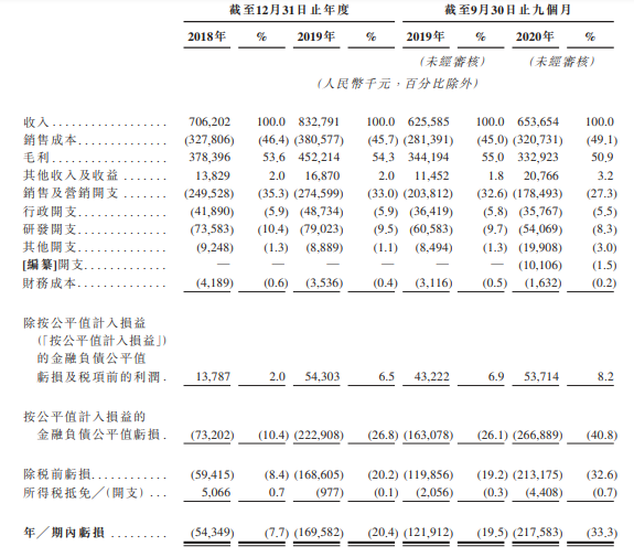 财务数据显示,2018年、2019年及2020年前9月,康圣环球分别实现收入7.06亿元、8.33亿元、6.54亿元;同期,该公司对应亏损为5434.9万元、1.69亿元、2.18亿元;经调整利润分别为1885.3万元、5332.6万元、5941.2万元;期内的毛利率分别是53.6%、54.3%、50.9%。此外,康圣环球报告期内的负债总额分别是11.94亿元、14.64亿元、19.44亿元。