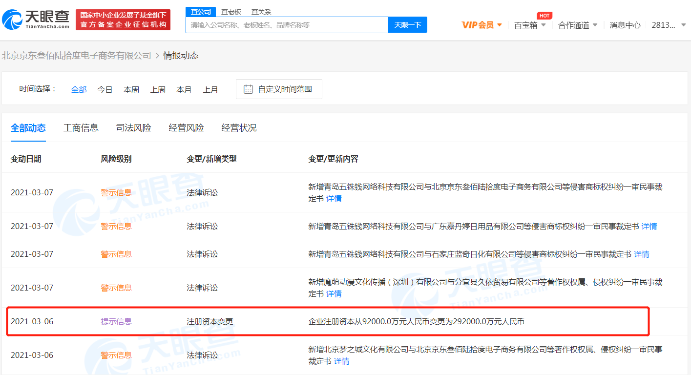 据天眼查APP显示,3月6日,北京京东叁佰陆拾度电子商务有限公司发生工商变更,注册资本由原来的9.2亿人民币增加至29.2亿人民币。