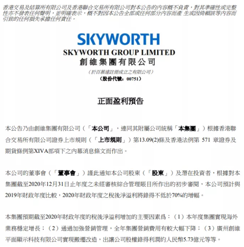数据显示,创维集团2019财年税后净利润为10.31亿元,以此作为基数估算,其2020财年税后净利润将不低于17.5亿元,业绩大幅超预期。