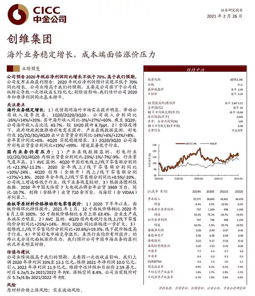 对此,中金公司上调创维集团2020年净利润33%至13.1亿元;国泰君安国际,则维持买入评级。