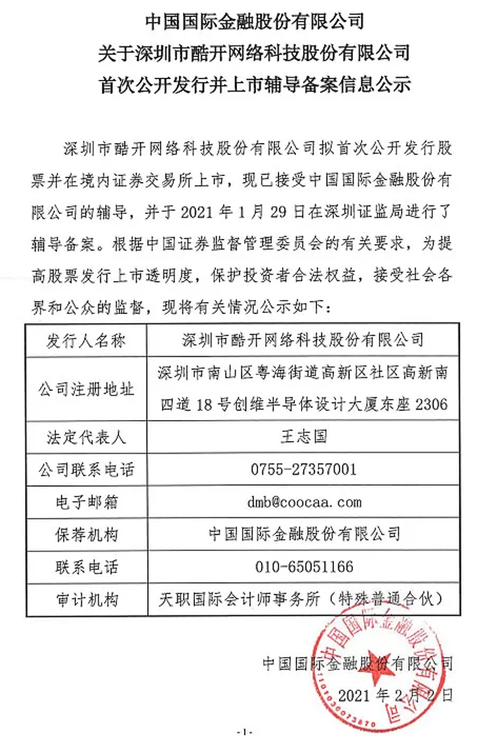 此前的2月18日,深圳市监管局披露了一则信息,显示酷开网络拟首次公开发行股票,并在境内证券交易所上市,现已接受中金公司的辅导,并于2021年1月29日在深圳证监局进行了辅导备案。