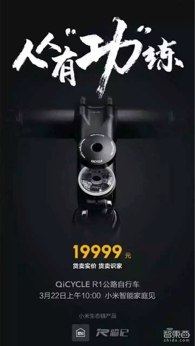 智东西3月17日消息,今天小米智能家庭官方微博发布了一张海报,宣布它们将在3月22日发布QiCYCLE R1公路车。售价3000 美元(折合人民币约 19495 元)!创小米单品史上最高价!