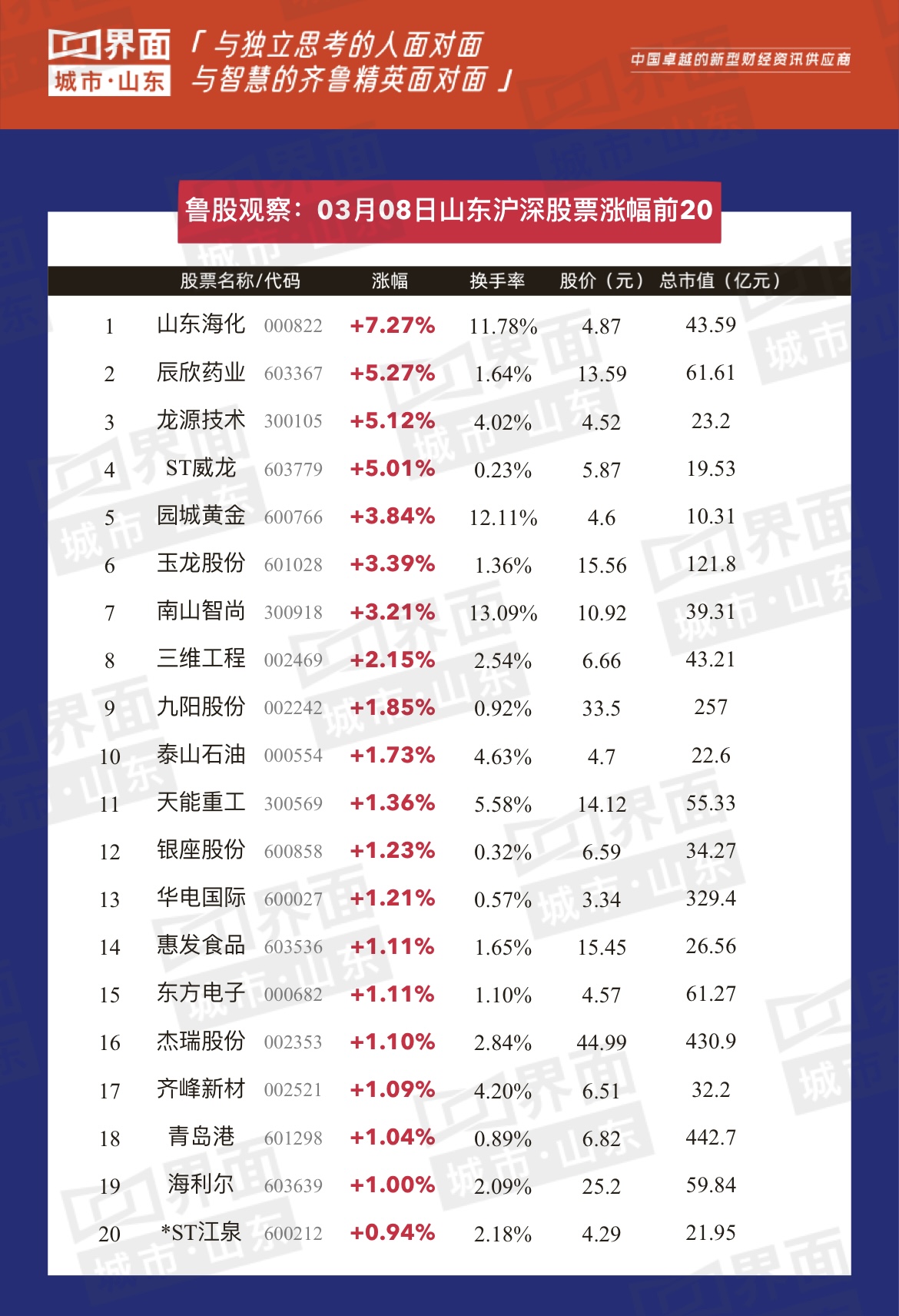 3月8日,山东35只股上涨,183只股下跌,9只股持平。
