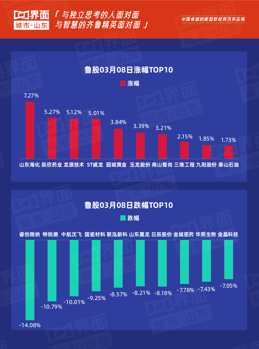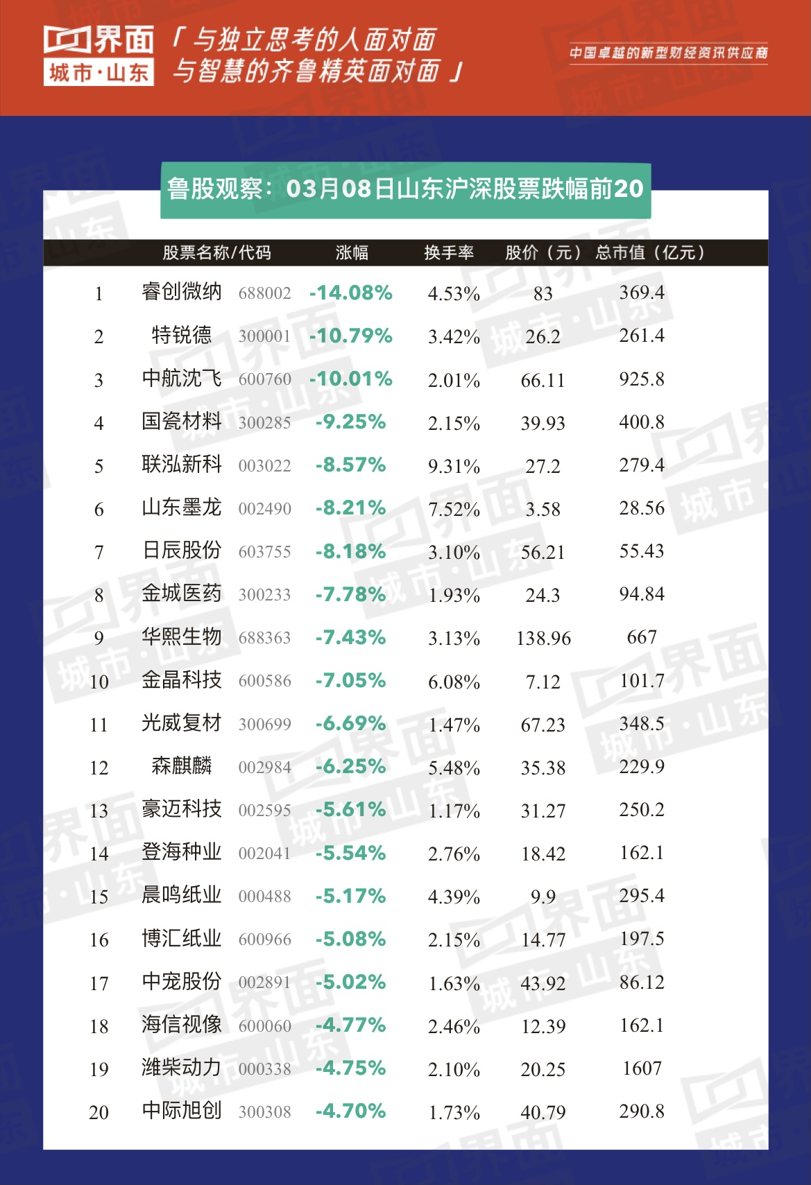 A股三大指数今日集体收跌,其中沪指下跌2.30%,收报3421.41点;深证成指下跌3.81%,收报13863.81点;创业板指下跌4.98%,收报2728.84点。两市合计成交9792.87亿元,行业板块大部分下跌,电力板块逆市上涨。北向资金今日净卖出85.89亿元。受大盘影响,3月8日,山东35只股上涨,183只股下跌,9只股持平。