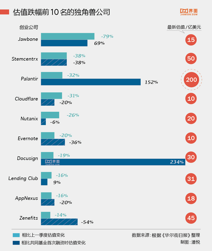 不少是一度大热的公司。估值排名第二的Airbnb估值有了1%的轻微下调;像Evenote估值折扣到了20%;最惨的要属可穿戴设备厂商Jawbone,近期F轮融资后估值较上一轮大幅下调了15亿美元,比上个季度估值下调了79%。