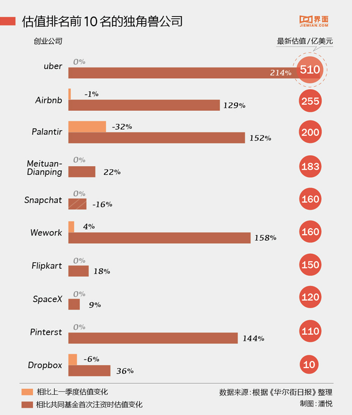 估值当然是下跌。《华尔街日报》对这些共同基金“买买买”的出价进行了追踪,发现他们在近期给出的估值大大打了折扣。这份报纸列出了前50名的估值,除了少数一两家——大火的AR公司Magic Leap估值在第一季度比2015年最后一个季度有了101%的增长,其它公司都在下跌或者持平。