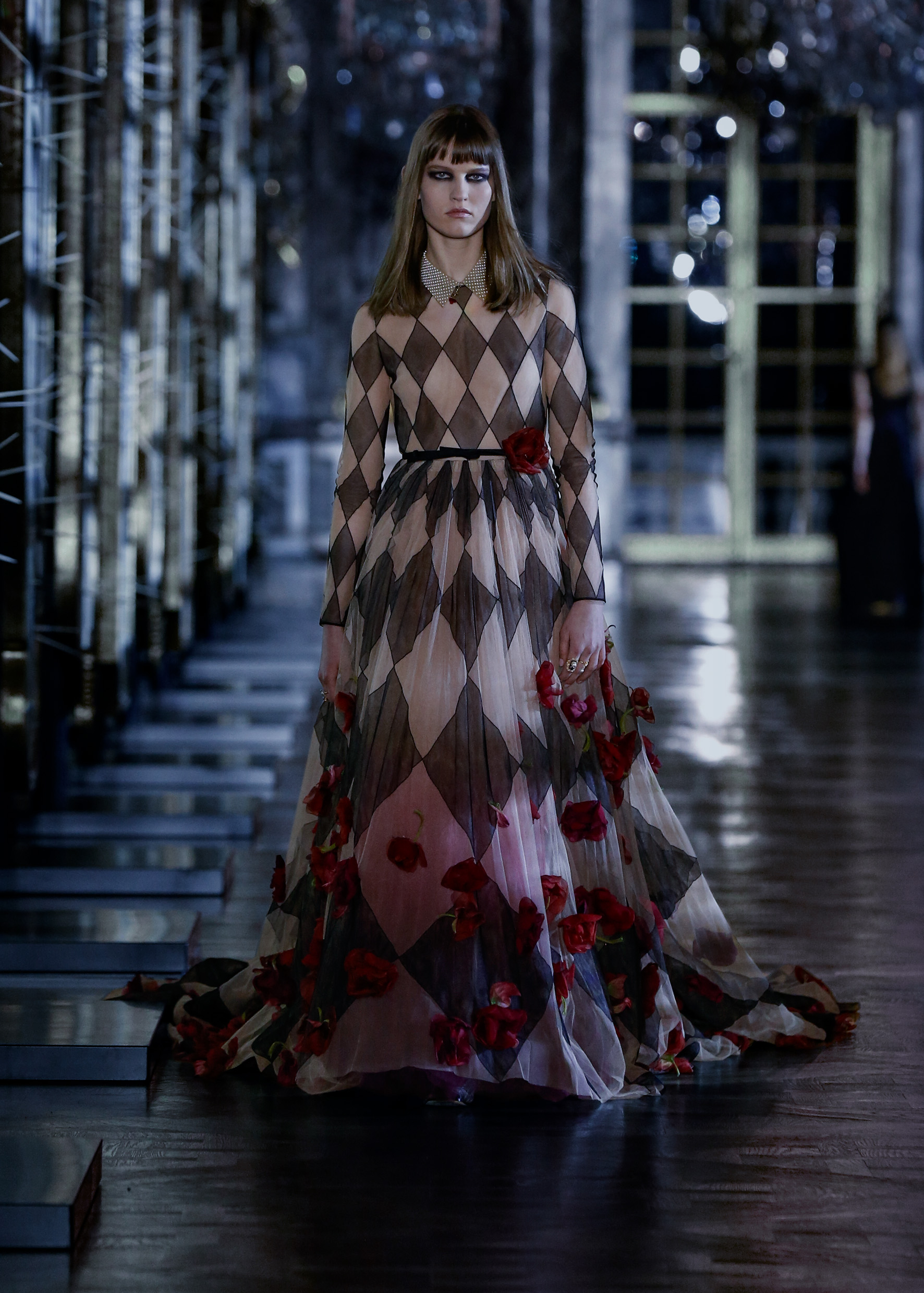 此次发布会在凡尔赛宫镜厅举办,整体呈现出浓郁的暗黑童话风格,全场共64套造型。玛丽亚通过对童话世界的探索,试图展现一种敢于质疑挑战、突破刻板印象的勇气。
