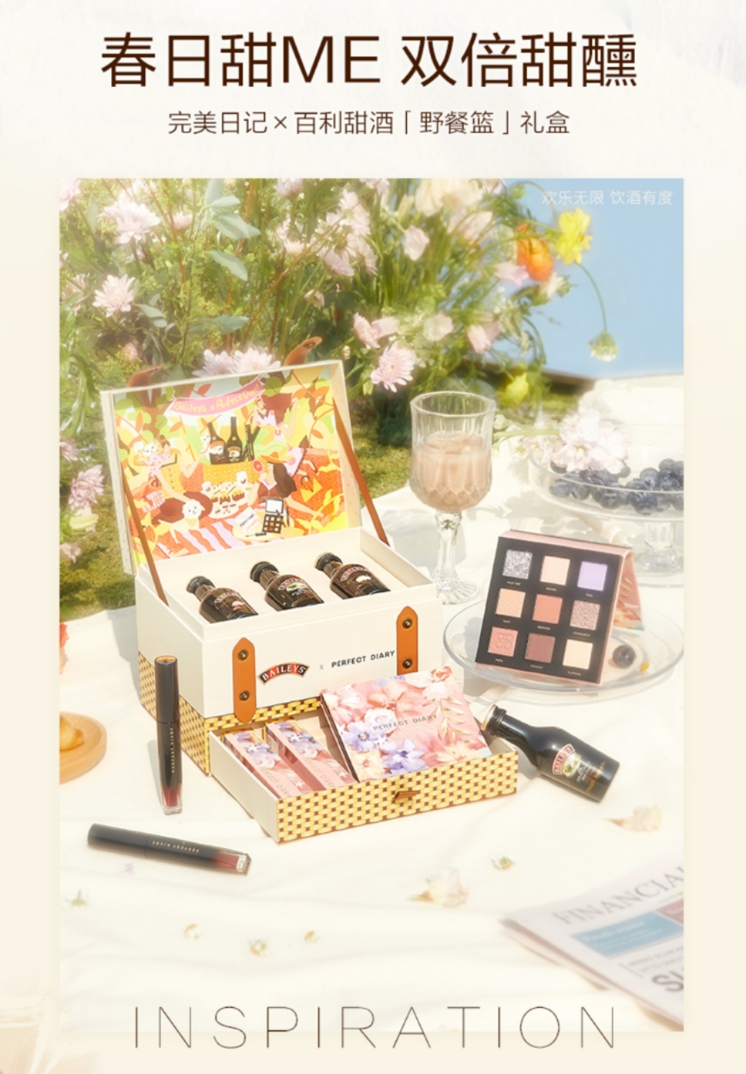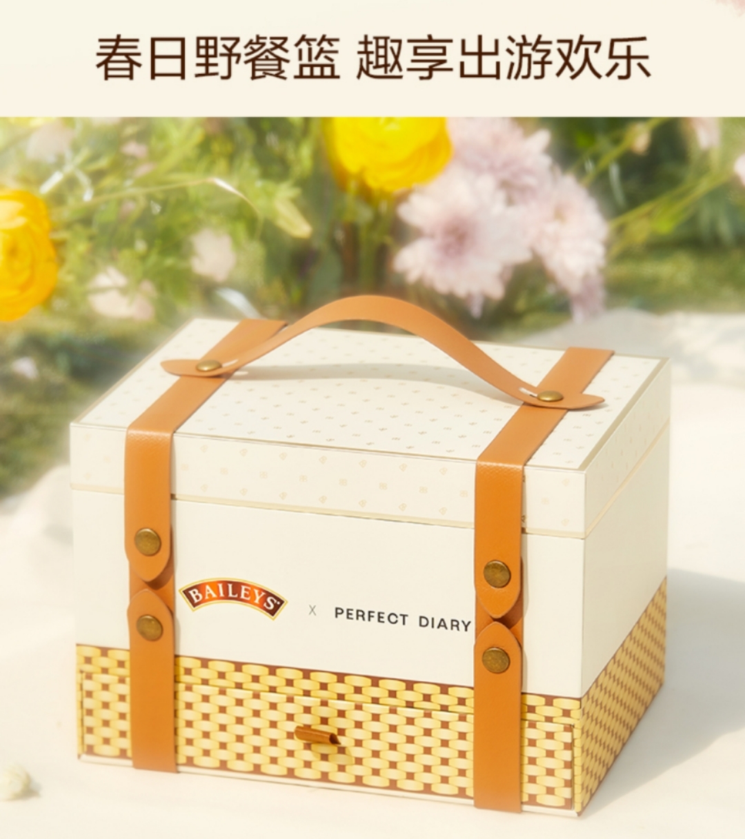 完美日记与百利甜酒合作推出限定联名「野餐篮」礼盒