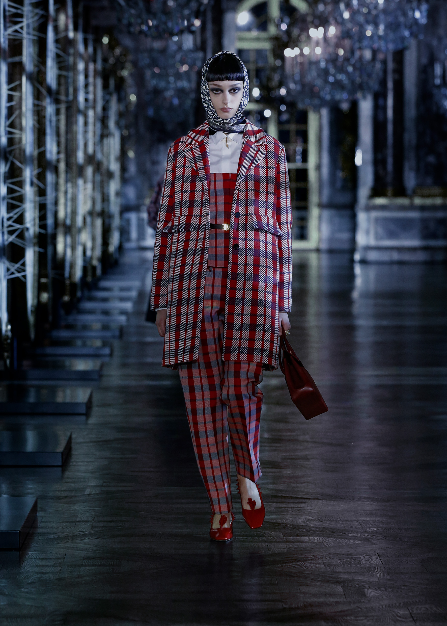 兜帽设计成为这一系列的鲜明特点,令人不禁联想到安吉拉·卡特笔下《小红帽》的经典装扮,也与发布会整体的童话风格相呼应。此系列的红色调与小巧外套相得益彰,给饰有兜帽的斗篷和雨衣注入一抹醒目亮色。红色古典玫瑰图案与格子呢的搭配,也令人联想起童话故事《美女与野兽》。