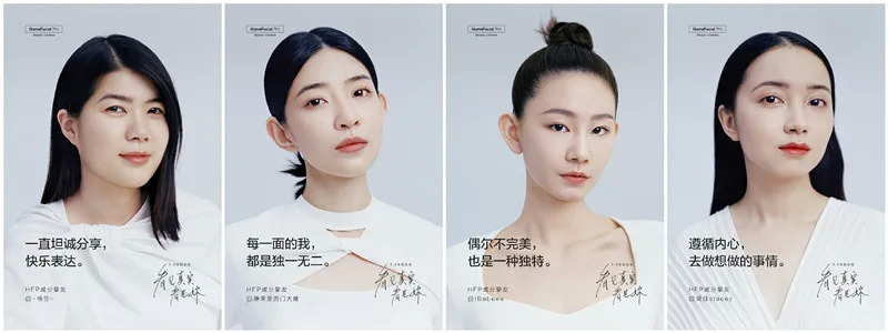 有相同主旨的还有新锐品牌HomeFacialpro,HFP今年3.8的企划以“看见真实 看见你”为中心,邀请了脱口秀演员@杨笠、时尚自媒体人@原来是西门大嫂 、「予她同行」项目发起人@梁钰stacey、 Z世代时尚博主@Ibabeee 等4位不同领域的女性代表。