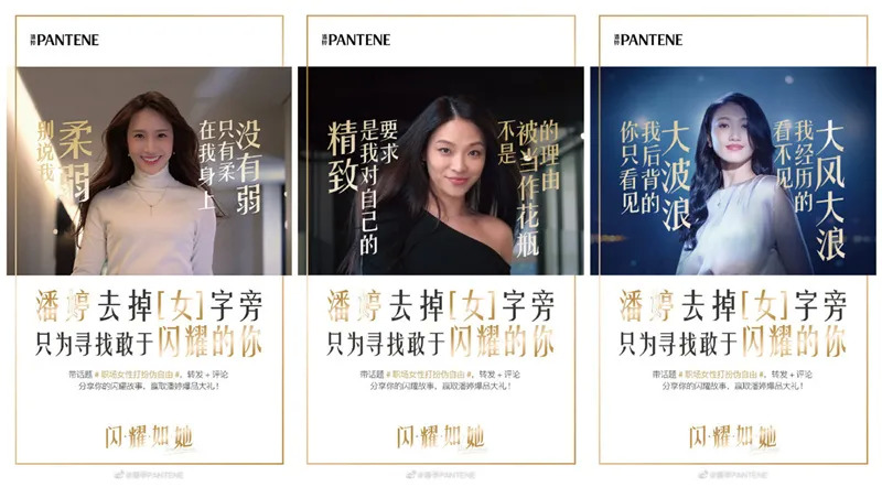 洗护品牌潘婷则从职场女性切入,表示目前不少女性在职场中都遭受过“打扮精致就是花瓶”“温柔就是没有领导能力”等刻板印象的歧视,希望能够击碎#职场女性打扮伪自由#。
