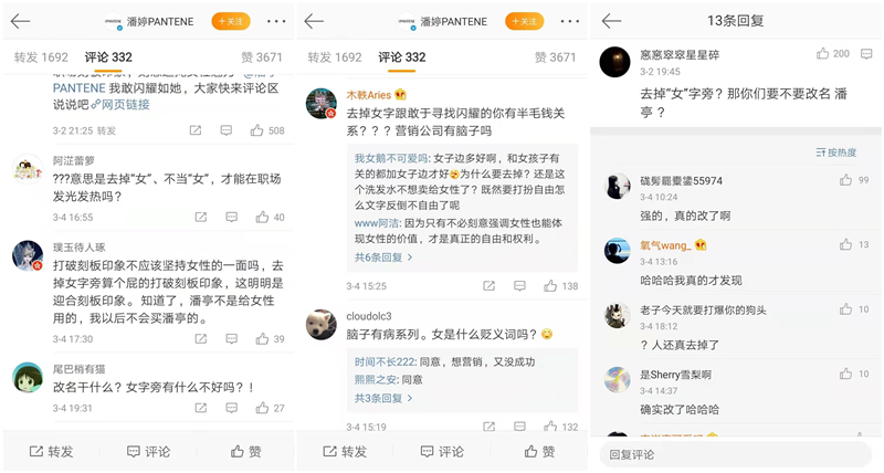 值得一提的是,3月2日潘婷发起“不丢掉‘她’,也能闪耀如她”的活动后,有网友表示“去掉女字旁,那要不要改为潘亭”,随后的两天里,潘婷顺应网友的建议将微博名改成了“潘亭PANTENE”(目前已改回),获得了不少网友的好感。
