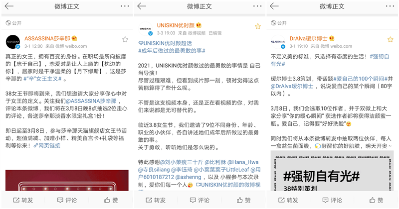 像优时颜就以9位不同身份、年龄、职业的女性,成年后所做过的最勇敢的事切入;伽蓝旗下的ASSASSINA莎辛,则邀请大家分享自己心中对于女王的定义;瑷尔博士以“有态度的生活”为核心,邀请消费者说出爱自己的某个瞬间。