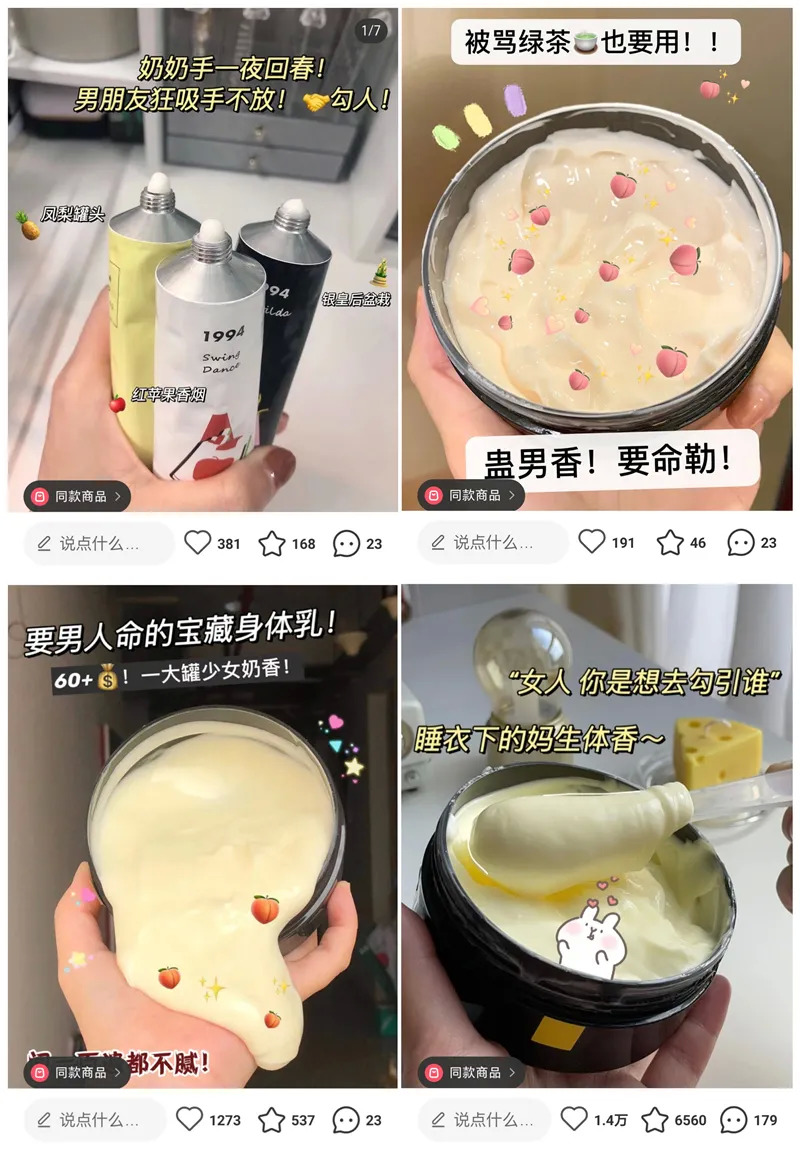 记者根据提示去小红书搜索了一番,发现不少以女性为主要受众的身体乳、护手霜品牌,其在小红书上的宣传文案都是以“被骂绿茶也要用”“男票不吸猫,吸我”等不尊重女性、取悦男性的字眼来吸引消费者。