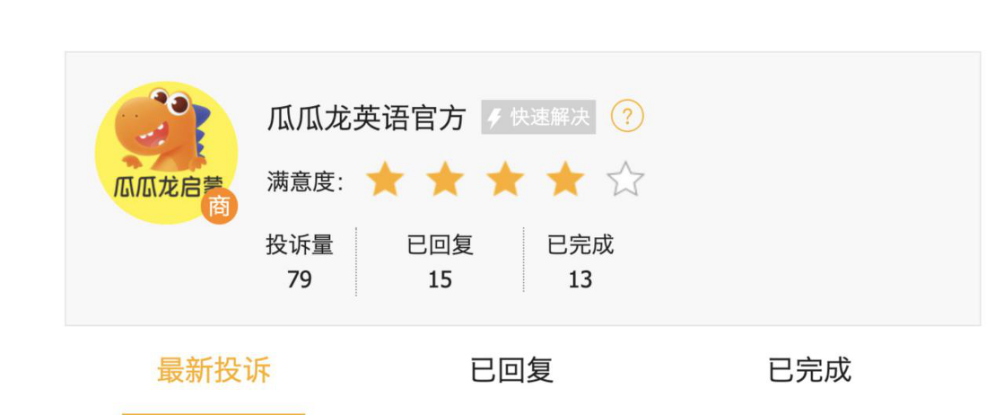 蓝鲸教育发现,今年以来,在黑猫投诉平台上,关于瓜瓜龙的投诉量快速增加。目前有76条,已完成13条,完成率仅为17%;回复仅15条。投诉内容涉及虚假宣传、电话骚扰、退费难等问题。