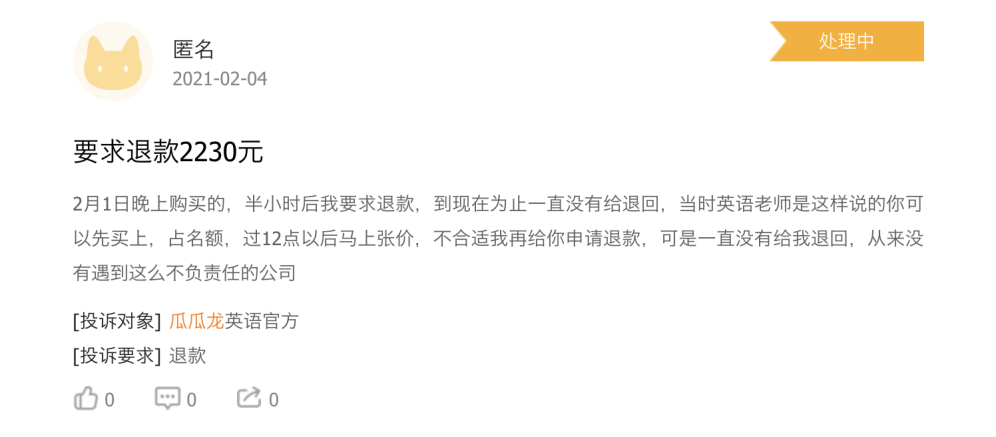 除了虚假宣传外,关于瓜瓜龙退款的投诉占比较大。有消费者表示“2月1日晚上购买,半小时后要求退款,到现在为止一直没有退回。”