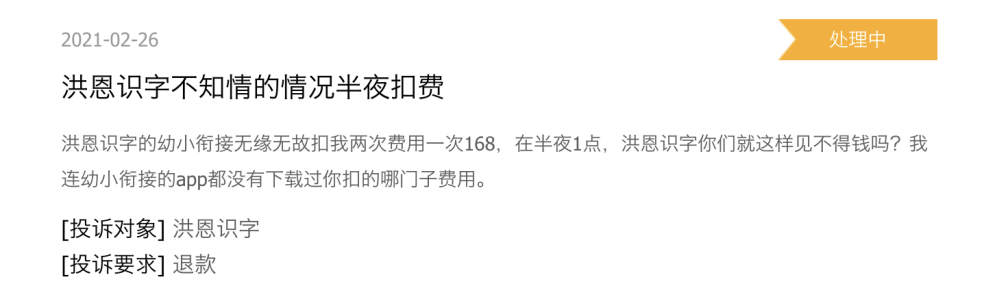 有用户投诉称,“洪恩识字缺少退款服务,买错了学习阶段,想退款却无人搭理”。同时,另有消费者投诉称,在要求退款时客服表示是虚拟产品不可以退款。此外,很多消费者表示因孩子误操作而重复支付,希望退费;但多次联系人工客服却无人接听。而洪恩识字在用户不知情的情况下自动扣费,也是消费者投诉的主要原因。