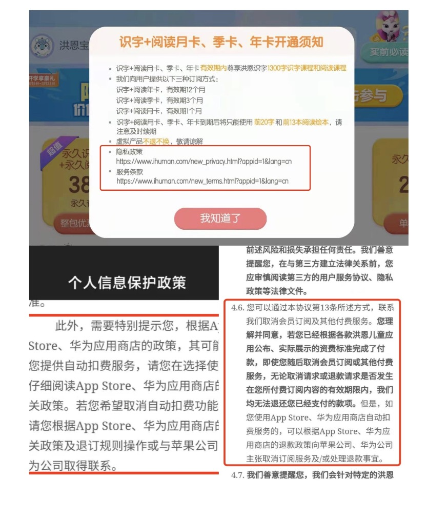 更让用户诟病的是洪恩识字的退款政策。在开通须知里,洪恩识字标明了“虚拟商品不退不换”的政策。