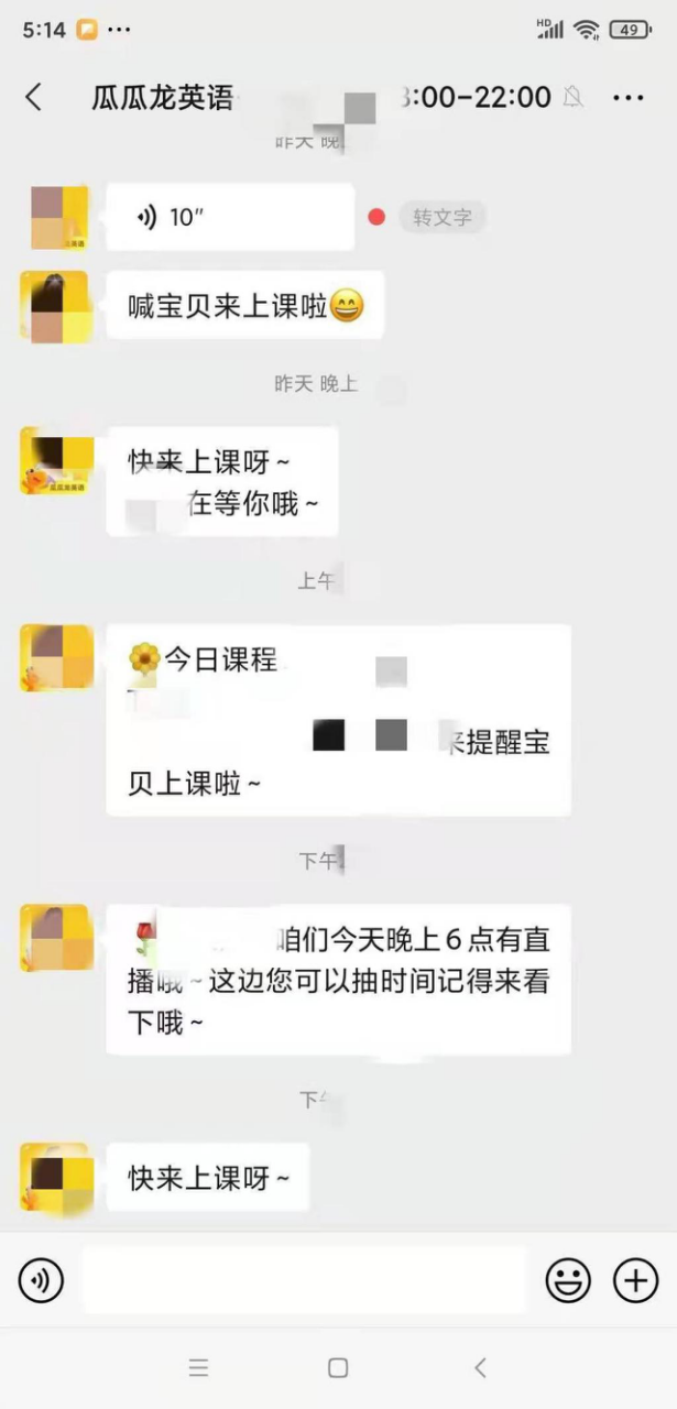 “孩子目前2岁,看见抖音上罗永浩推荐的瓜瓜龙英语,感觉还挺便宜,就花28元购买了体验课。但随后微信轰炸不断,给我的工作带来了一定困扰。但我下班后还要带着孩子学英语,所以也不好删除代课老师的微信和退群。”王女士表示。
