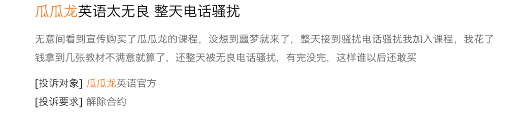 与王女士有相同经历的人不在少数。“无意间看到宣传后购买了瓜瓜龙的课程,没想到噩梦就来了,整天接到骚扰电话让我加入课程”,有用户在黑猫投诉上称。