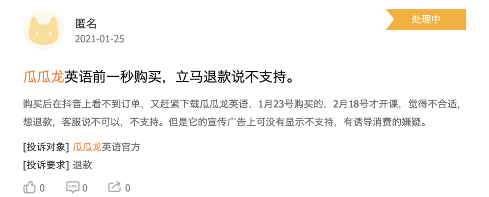 还有消费者在1月25日投诉指出,“在抖音上看不到订单,又赶紧下载瓜瓜龙英语。1月23号购买,2月18号才开课。觉得不合适、想退款,客服说不可以不支持,而在它的宣传广告上没有显示不支持,有诱导消费的嫌疑。”