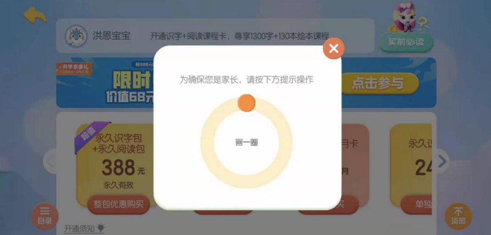 在洪恩识字APP付款页面,其识别家长或孩子的方式,仅有“为确保您是家长,请按下方提示操作”的页面。这个简单的画圈识别方式,2岁的孩子也能操作;完全无法判断出是家长操作还是孩子操作。