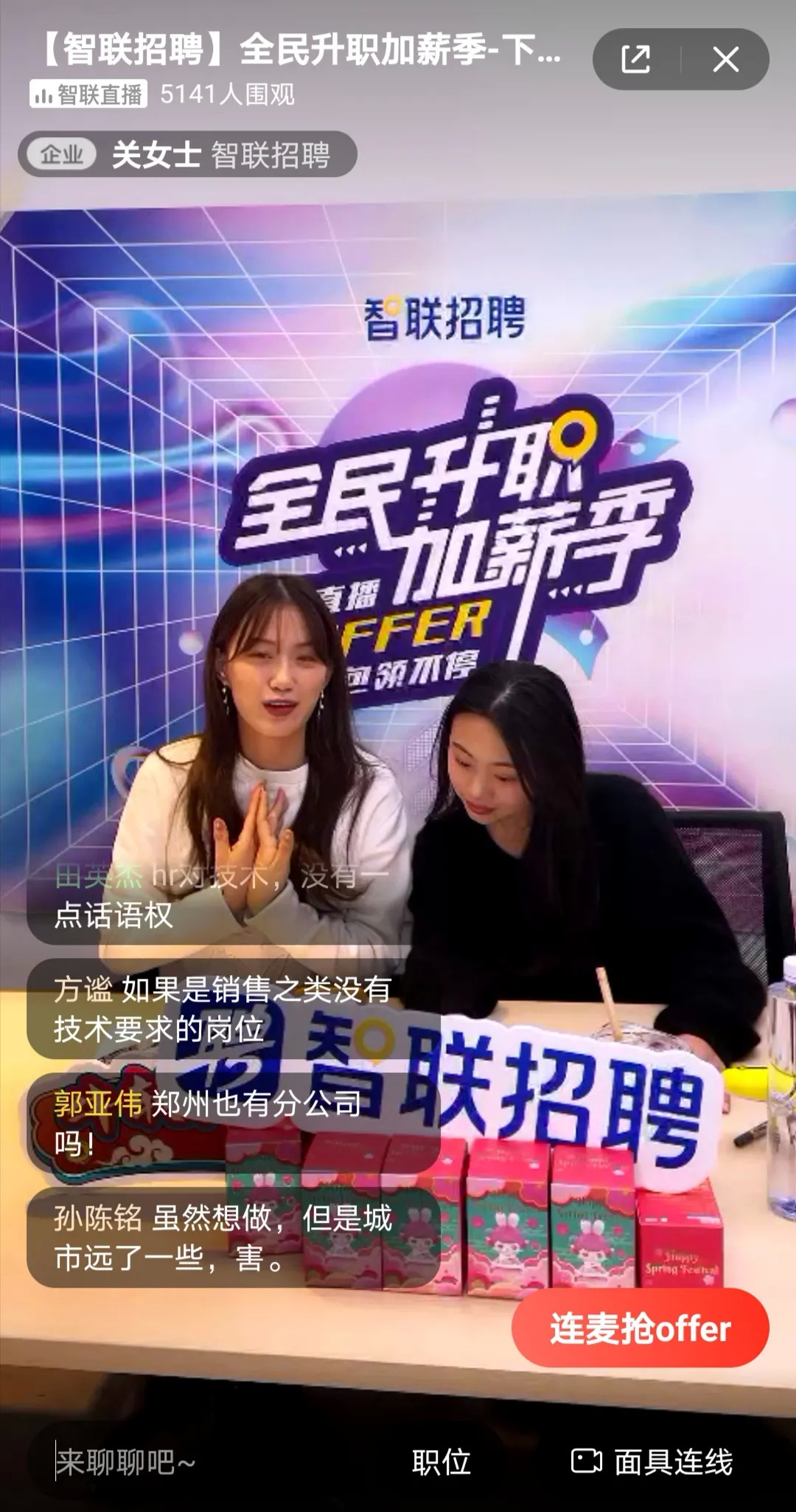 打开“智联招聘—职位—看直播抢offer”,可以看到丰富的直播间,它们代表了不同地区、行业和企业的招聘专场。预约感兴趣的招聘专场后,就能在直播开始前收到开播提醒,即使错过了某个专场,后续也能观看回放。